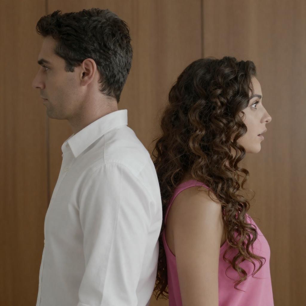 Portrait of a man with short dark hair wearing a blue shirt and white jacket, accessorized with a gold choker necklace. A woman with long dark hair dressed in a white lace top stands behind him, holding a triangular wooden frame over his head. The background features a large decorative vase, and both subjects have serious, focused expressions. The image captures a modern, artistic composition with cultural elements.