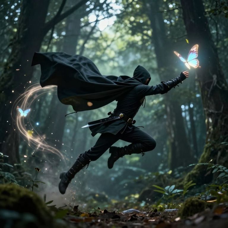 Digital artwork of a hooded, black-cloaked figure mid-leap, catching a glowing butterfly in a mystical, dense forest with ethereal light