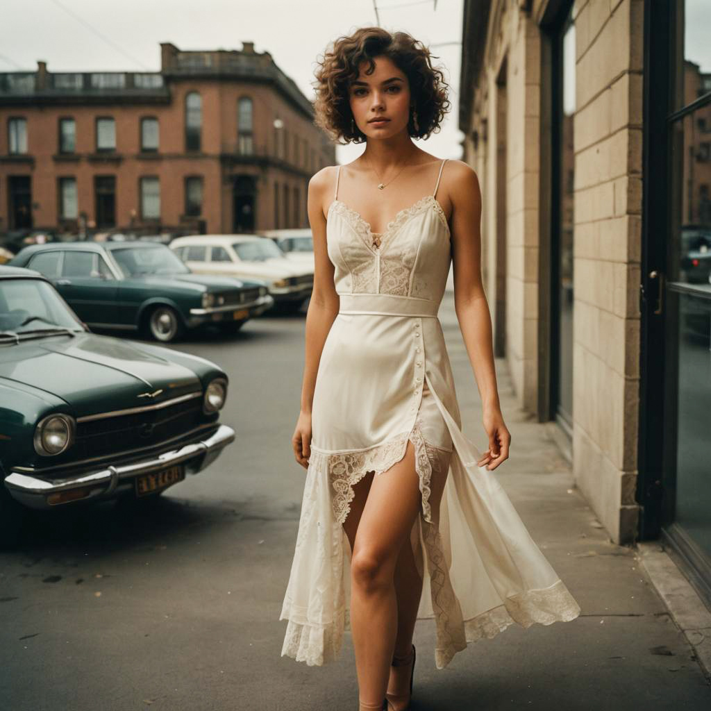 Photo of a Short Legs woman, Curly Top, silk slip dress with a thigh-high slit and lace trim, vintage film grain aesthetic.