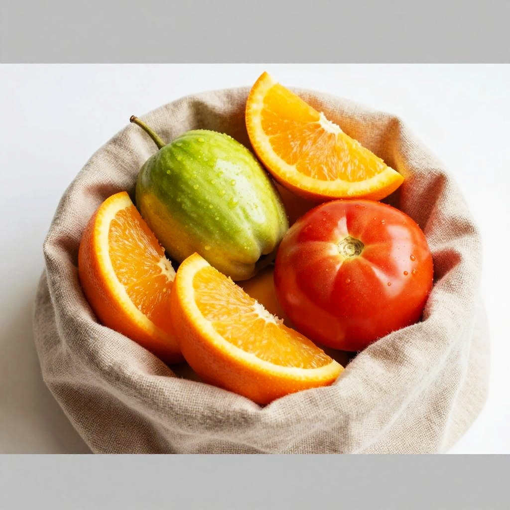 Photograph of a colorful, vibrant mix of fruits and vegetables nestled in a loosely wrapped, beige, textured cloth. The fruits and veggies include bright orange slices, a green cucumber, a chunk of red tomato, and a piece of yellow fruit, all overlapping and creating a lively, fresh presentation against a stark white background. The top and bottom edges are gray.