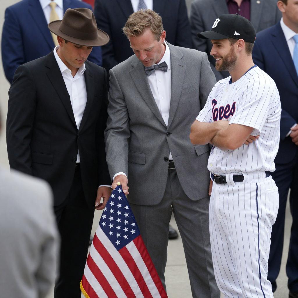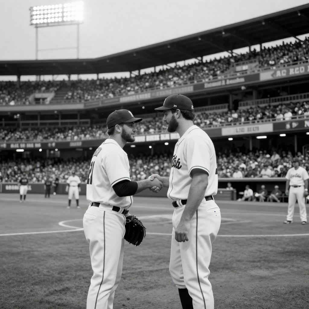 Black-and-White Baseball Stadium Handshake Moment