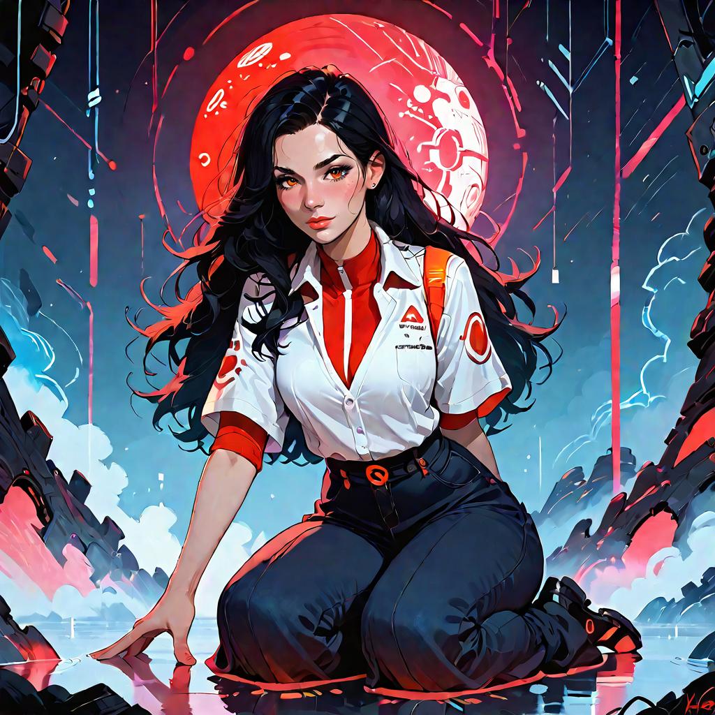 Digital artwork of a cybernetic adventurer girl with long black hair kneeling on a reflective surface. She is dressed in a white and red shirt with dark pants, set against a dark neon blue and red background featuring an enormous spherical spaceship and a rainy, otherworldly atmosphere.