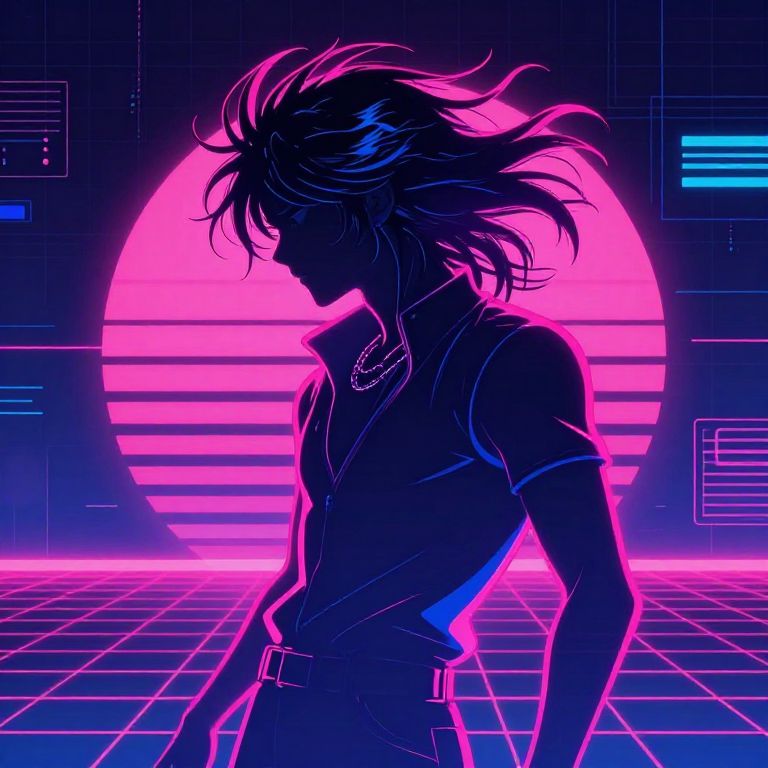 Neon pink and blue silhouette of a confident male with long hair, wearing a button-up shirt, against a retro grid background with a glowing pink sun