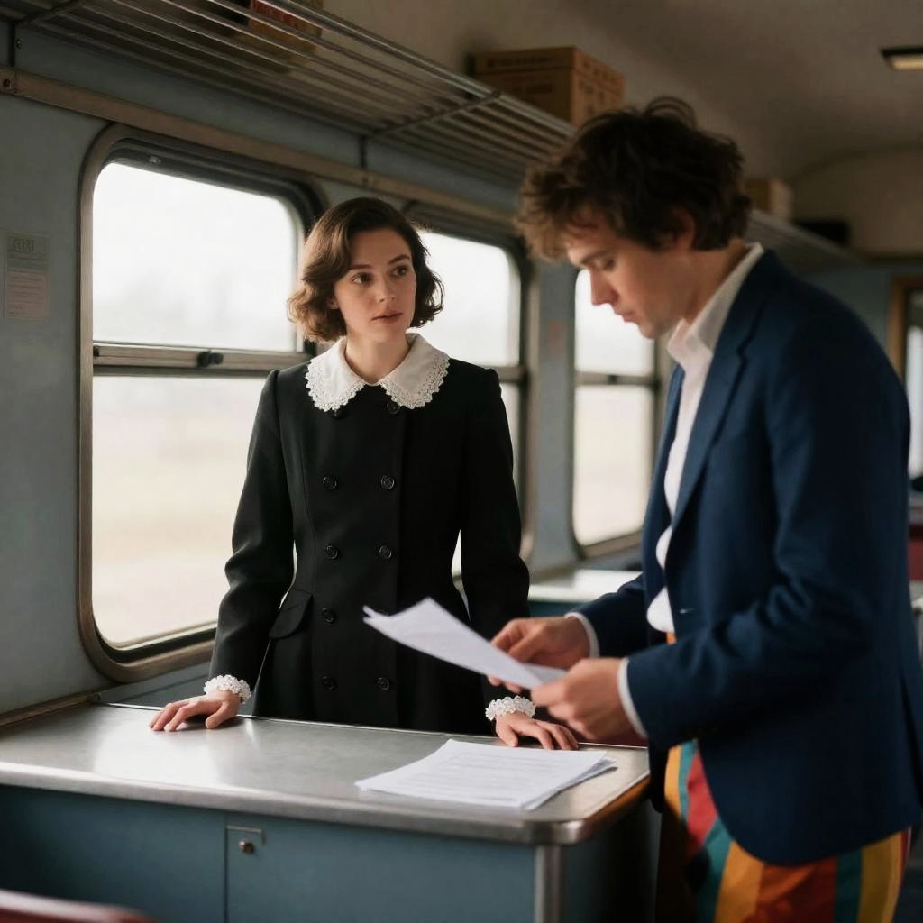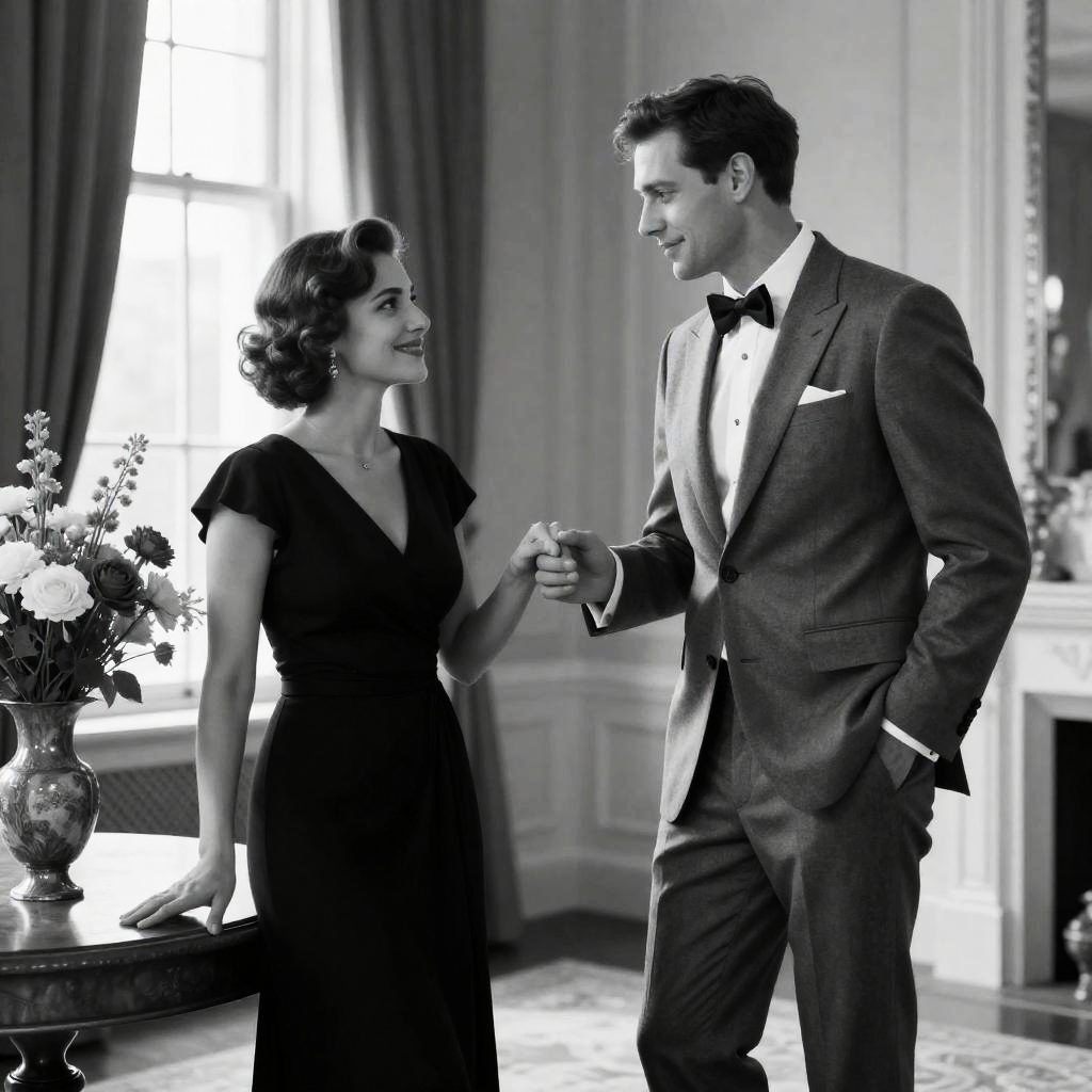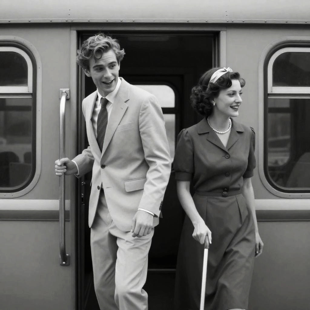 Black-and-white photograph of a man and woman exiting a train. The man, in a light suit, grabs the train door with a joyful expression. The woman, in a dress and headband, holds a cane and smiles. Both have short, curly hair. Train windows and metal details are visible. The man is on the left, the woman on the right.