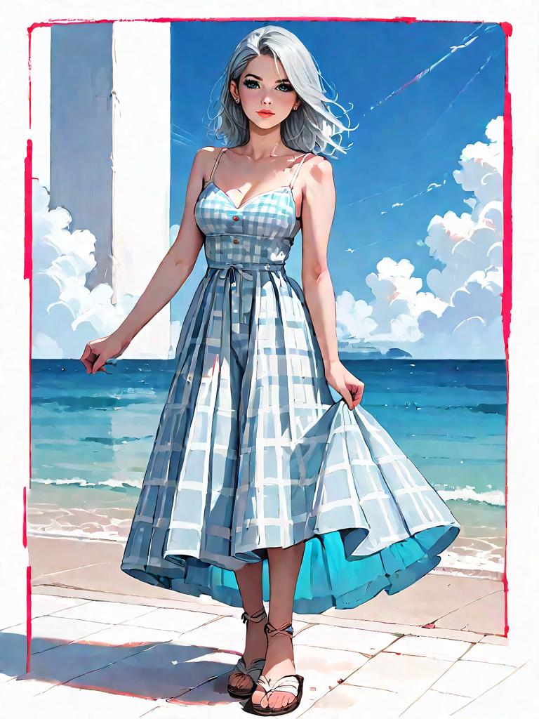 1girl, source_comics, realistic face, full body shot, Woman, casual summer, spaghetti-strap checkered midi dress in light blue and white, square neckline, slit on one side, silver strappy sandals, white studio background