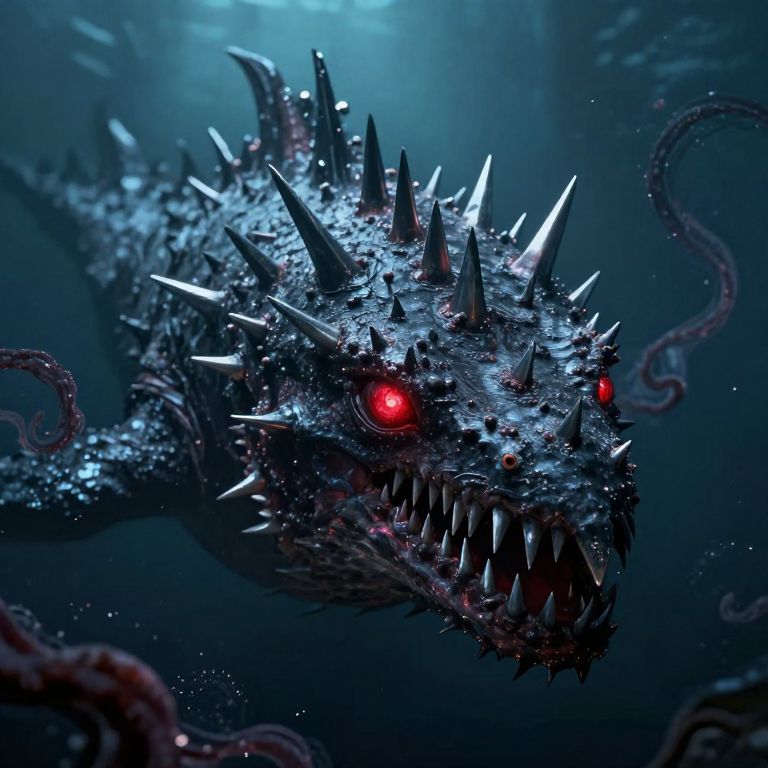 Digital CGI artwork of a fearsome, underwater sea monster with a dark blue-gray, scaly body. The creature's head is adorned with numerous sharp, metallic spikes, and its glowing red eyes exude a menacing glare. Its mouth is wide open, revealing numerous sharp, white teeth. Dark, tentacle-like appendages curl around the creature's body in the background. The underwater setting is illuminated by a soft blue light, creating a haunting atmosphere. The texture of the monster's skin is rough and jagged, enhancing its terrifying appearance.