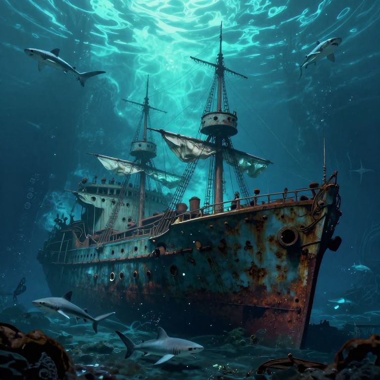 The image depicts a surreal underwater scene featuring a large, ancient-looking ship resting on the ocean floor. The ship, with its weathered and rusted exterior, appears to be from a bygone era, evoking a sense of historical significance. The underwater environment is filled with a mysterious, ethereal glow, casting an otherworldly ambiance over the scene. Several sharks, with sleek, streamlined bodies, swim around the ship, adding a sense of danger and unease. The background is a mix of dark, shadowy forms and glowing, ethereal lights, creating a hellish atmosphere. The overall composition is highly detailed, with intricate textures and a rich color palette dominated by deep blues and greens, enhancing the sense of depth and immersion. The scene is both realistic and stylized, blending elements of horror and historical illustration to create a hauntingly beautiful underwater landscape.