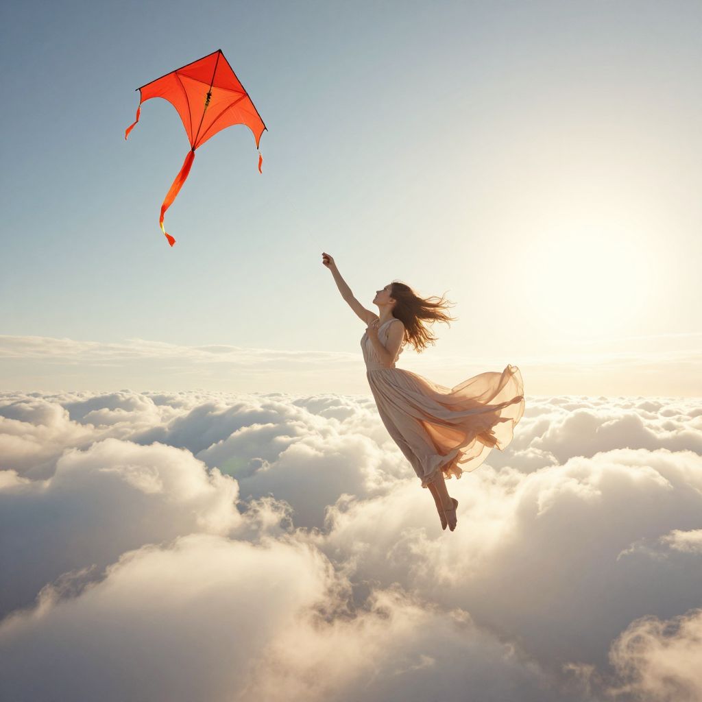 A woman in a flowing dress defies gravity, soaring amidst billowing clouds while holding onto a vibrant red kite that dances against the radiant sun, creating a dreamlike scene where earthly boundaries dissolve into the ethereal.