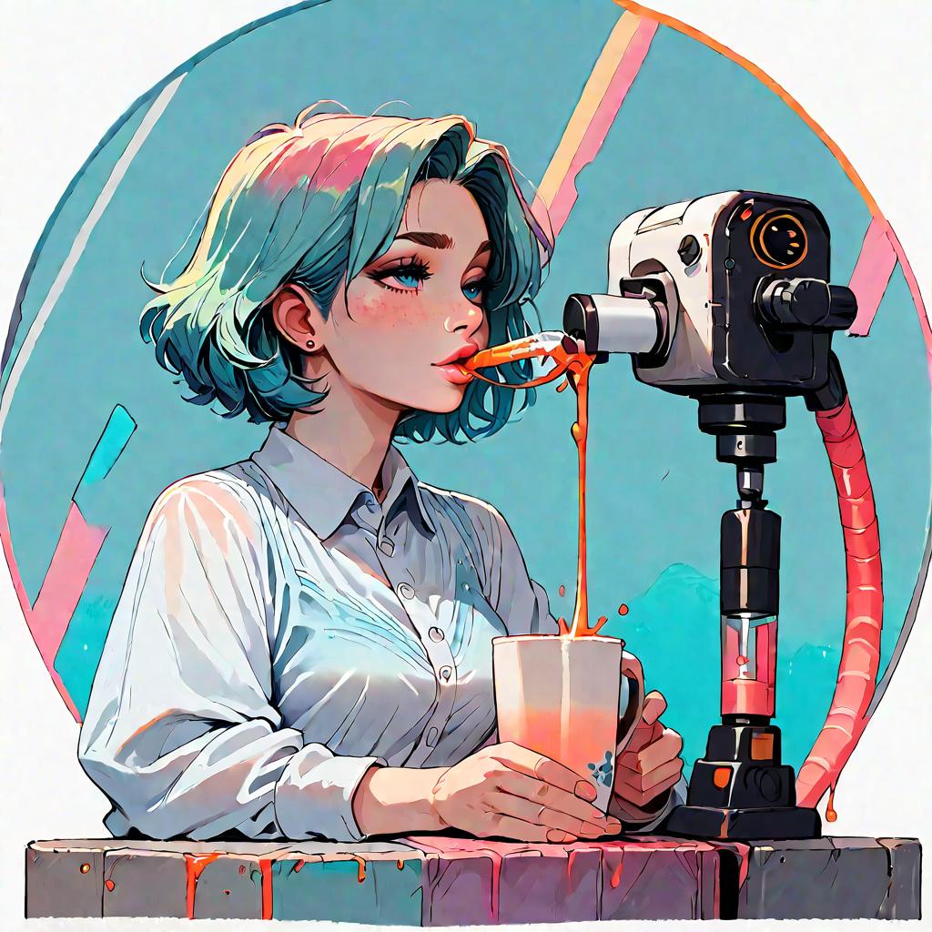 Score_9, score_8_up, bubblytech, scifi, transparency, caustics, iridescent, coffee machine, pouring liquid