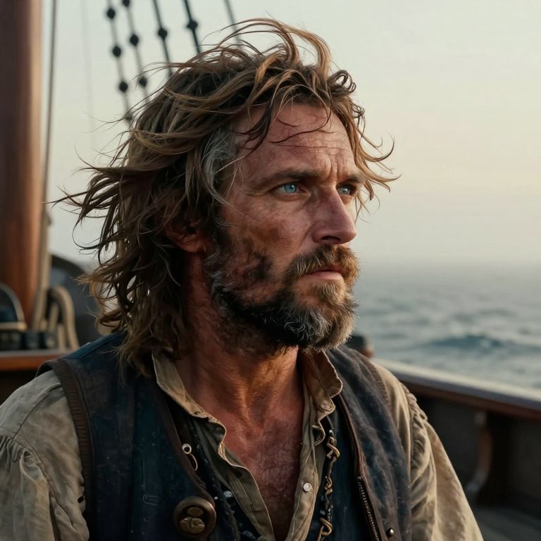 Craft a photorealistic portrait of a weathered sailor with wind-tousled hair and piercing blue eyes, his rugged features adorned by a salt-and-pepper beard. Positioned on an old wooden ship's deck, he gazes towards the horizon, exuding solitude and longing as his expression shifts from introspection to a distant, wistful look that reflects inner turmoil. Employ high-resolution digital painting techniques to capture realistic skin textures, intricate clothing details, and nuanced facial expressions. Soft, warm lighting adds depth and contrast against the vast, foggy ocean landscape in the background.