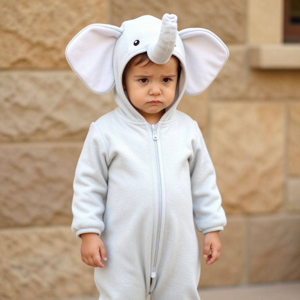 A photograph of a young child standing in front of a stone wall, wearing a cute, light gray elephant onesie with large ears and a trunk hood. The onesie is slightly shiny, and the child has a neutral expression with a slight frown. The background is slightly blurred, emphasizing the child's outfit. The image has a warm, natural light.
