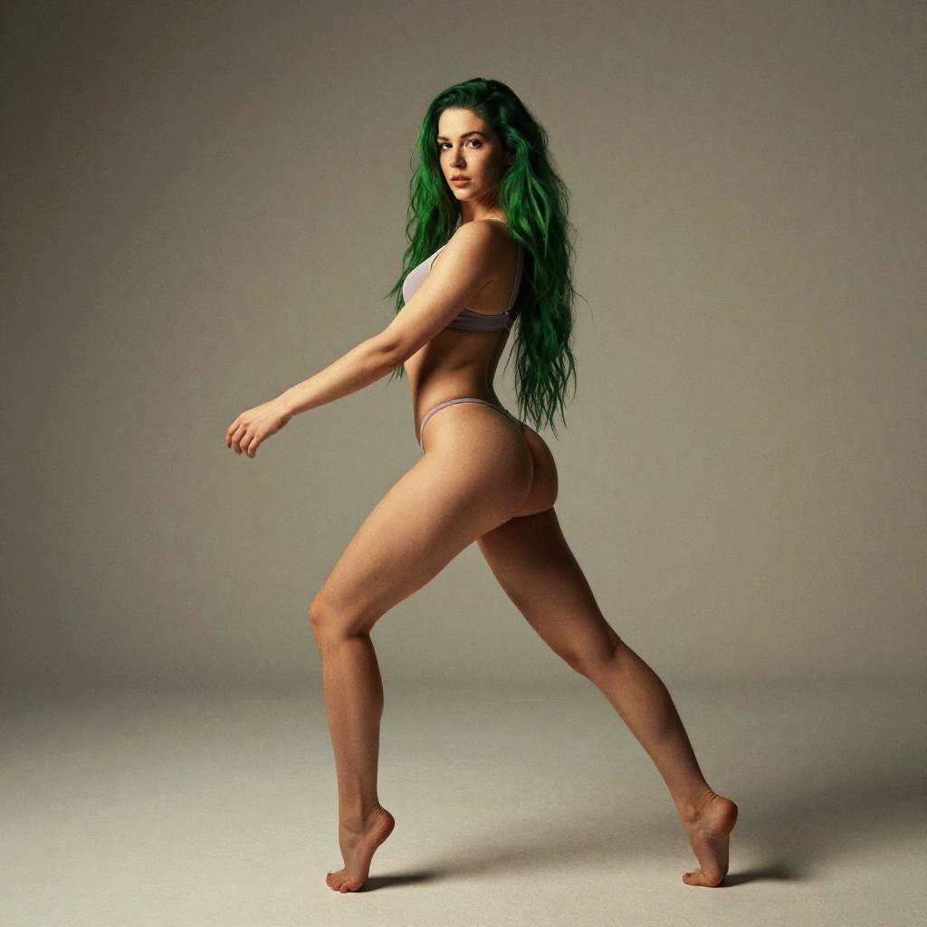 Photograph of a fit, fair-skinned woman with long, wavy green hair, wearing a minimalistic, beige thong bikini. She is standing in a side profile, balancing on the balls of her feet, with her left arm extended forward and right arm slightly back. Her toned muscles are visible, particularly in her legs and glutes. The background is a plain, gradient grey, with soft lighting highlighting her curves and contours. The image has a realistic style, emphasizing the subject's athletic physique and natural beauty.