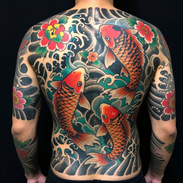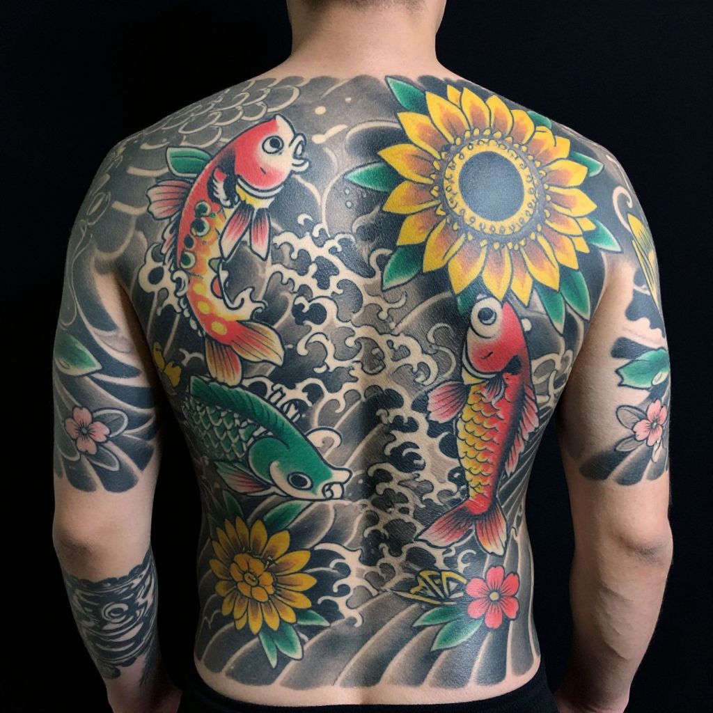 Photograph of a man's back covered in vibrant, intricate Japanese-style tattoos featuring colorful koi fish, a green and red dragon, and white cherry blossoms amidst black, swirling waves. The tattoos are highly detailed with bold outlines and vivid colors, including red, green, yellow, and white. The man has short black hair and is standing against a backdrop of a traditional Japanese screen with a floral pattern. His skin is light, and the tattoos cover his entire upper back. The overall style is traditional Japanese tattooing (Irezumi).