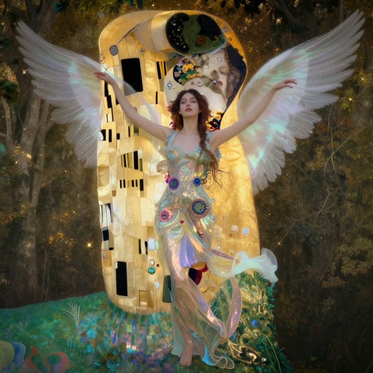 Envision an enchanting landscape imbued with the alluring intricacy reminiscent of Gustav Klimt's work, where a beguiling figure emerges from the foreground. From an elevated vantage point, witness this celestial being draped in an exquisitely detailed, iridescent gown that seems to pulse with life under the soft, golden illumination filtering through the verdant canopy above. As her gossamer wings dance in the gentle light, she embodies a captivating blend of ethereal grace and profound humanity, beckoning the observer into a realm where reality entwines with fantasy. This evocative tableau elicits a sense of awe, beauty, and introspection, challenging our perception of existence as we know it.