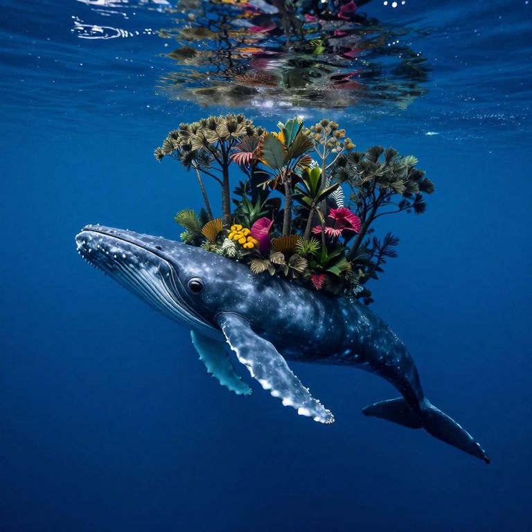 Photograph of a humpback whale underwater, adorned with a colorful bouquet of tropical flowers, surrounded by deep blue ocean.