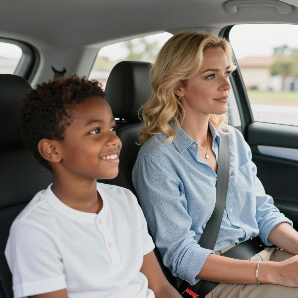 Three people in a car. Foreground: middle-aged man with gray hair, white shirt, black suit, driving, serious expression. Background: young woman with brown hair, green jacket, smiling, looking forward. Young girl with brown hair, green jacket, resting head on hand, looking down. Car interior, leather seats, daylight outside.
