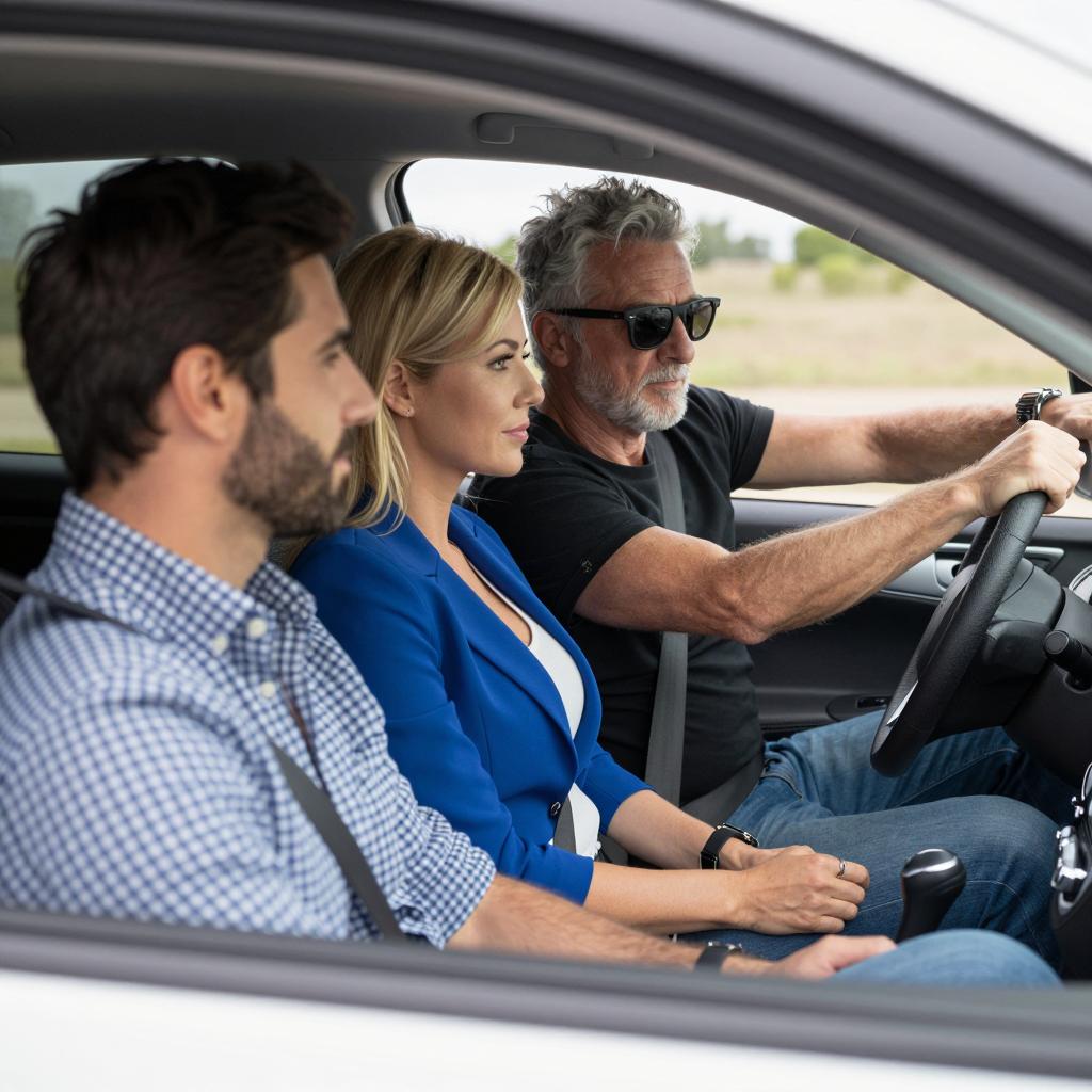 Middle-aged man with gray hair, wearing a white shirt and black suit, is driving a car with a serious expression. Next to him sits a young woman with brown hair wearing a green jacket, smiling and looking forward. The car interior features black leather seats and daylight is visible outside.