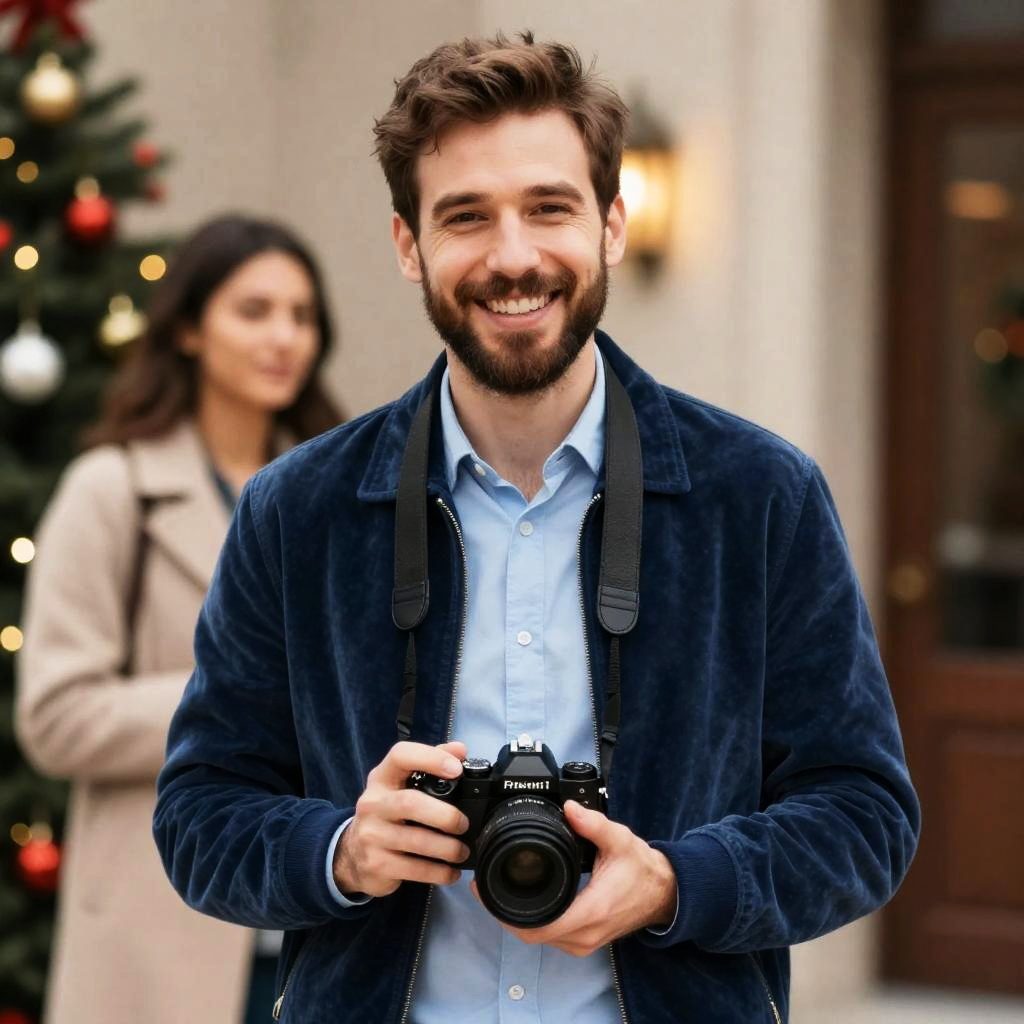 Photograph of a smiling man with short brown hair and a beard, wearing a blue velvet jacket over a light blue shirt, holding a camera with both hands. A woman with long dark hair in a beige coat stands in the blurred background. Christmas lights and decorations are visible in the background.