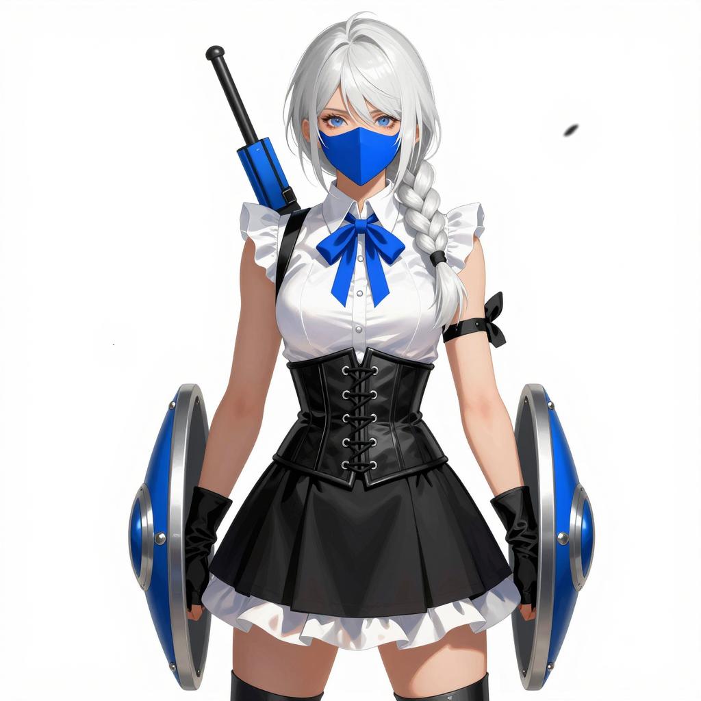 Digital illustration of a female cyborg with white short hair, black gas mask, white cropped jacket, black pants, and cybernetic arms. She holds a sword in her right hand, katana on her back. Her midriff is exposed with a tattoo. Dark gradient background. Intense expression.