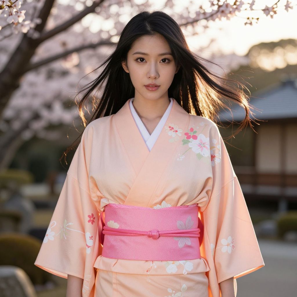 Photograph of an Asian woman with long black hair, wearing a peach kimono with pink obi, standing in a cherry blossom garden at sunset.
