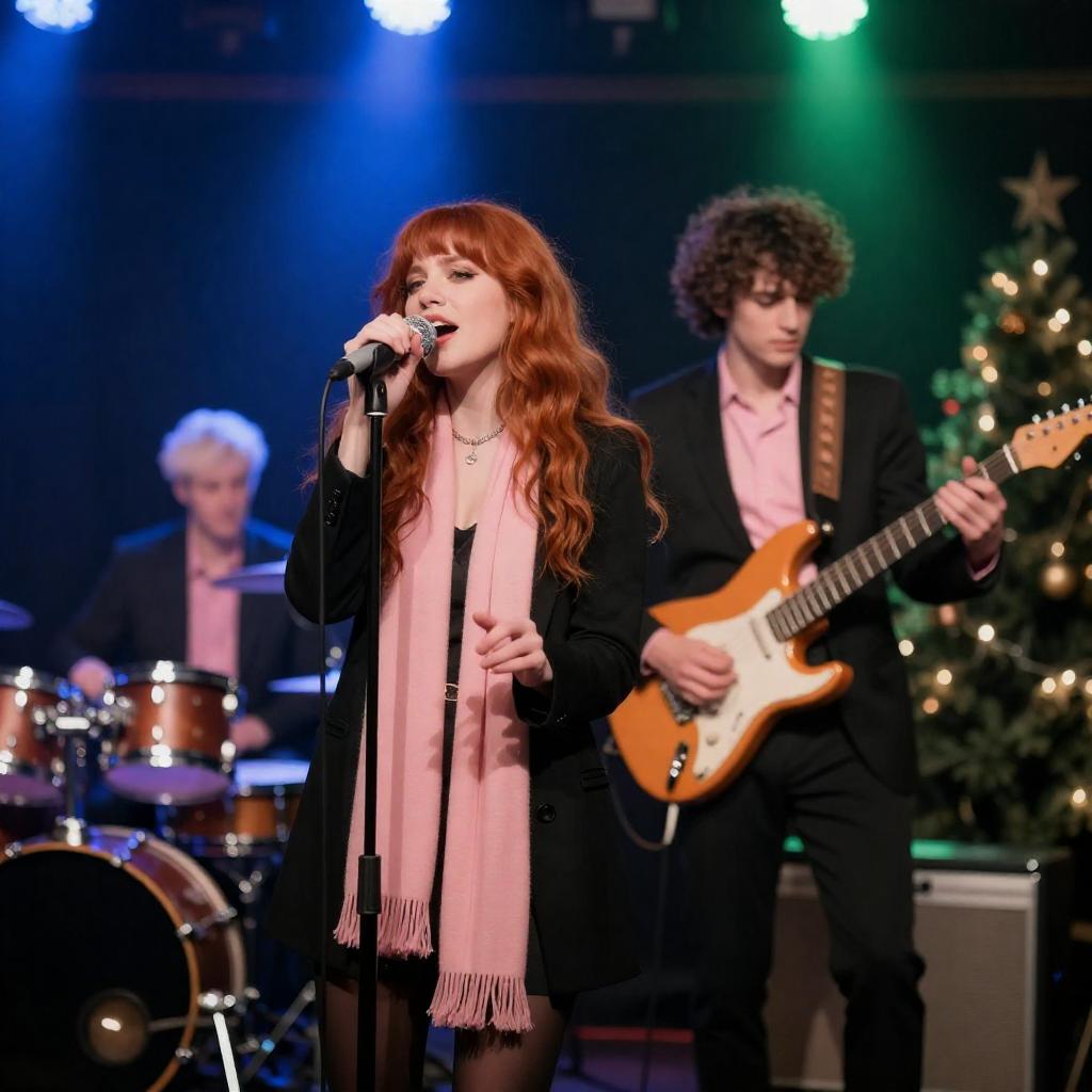 Photograph of a band performing. Female singer with long red hair, wearing black coat and pink scarf, singing into microphone. Male guitarist with curly hair, black suit, and pink shirt. Drummer in background with white hair. Stage lights in blue and green. Guitarist playing orange electric guitar. Drum set on left. Christmas lights on right.