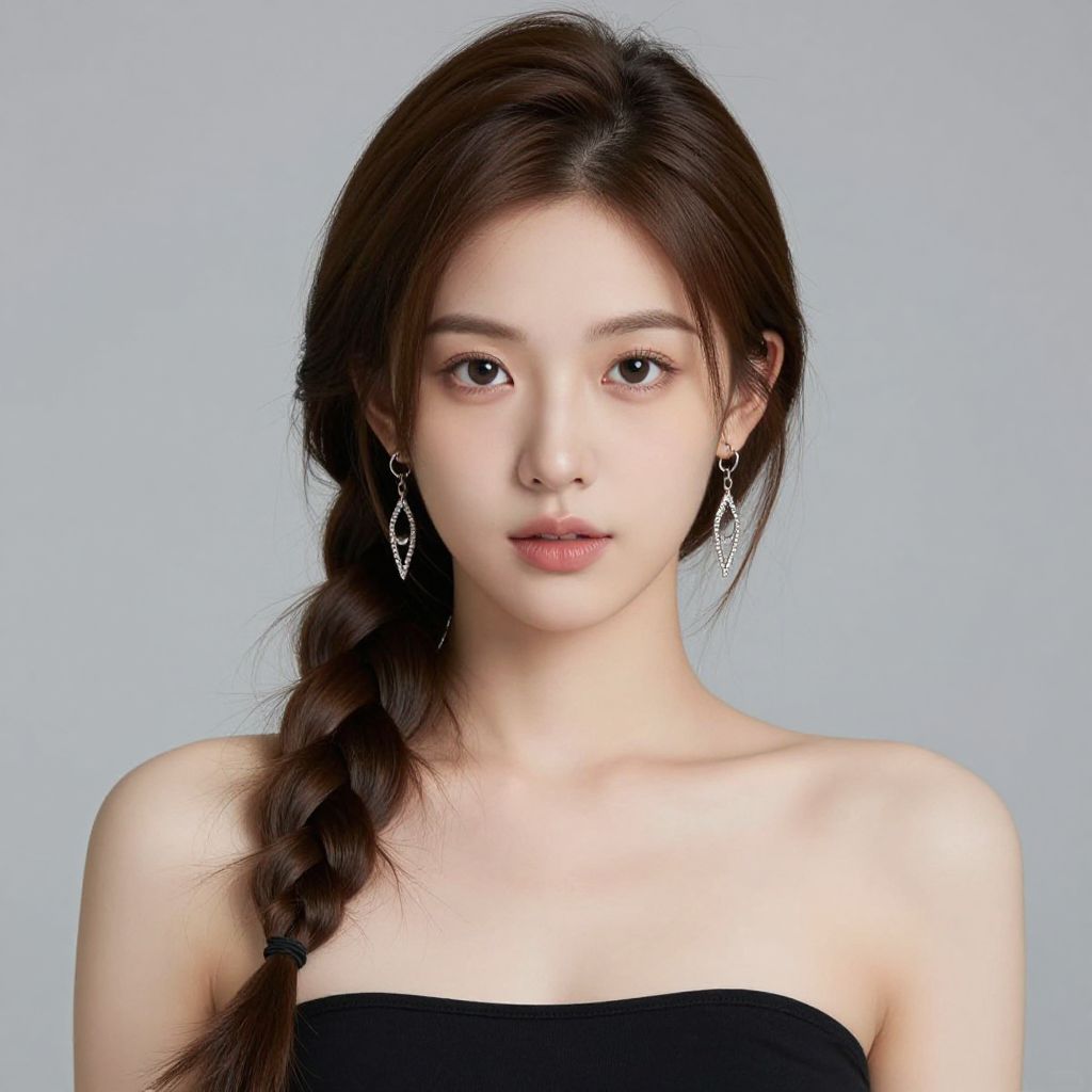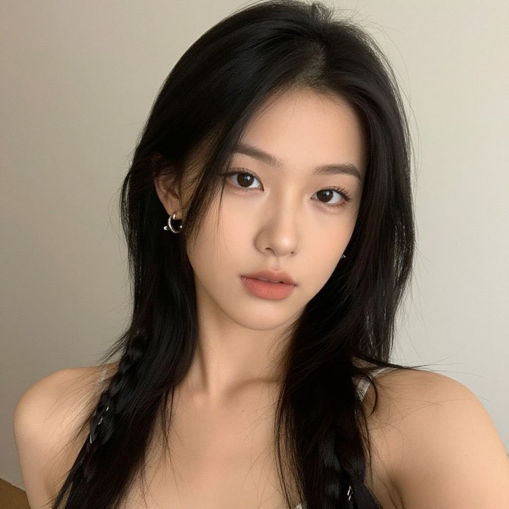Photograph of an Asian woman with fair skin and long black hair in a side braid. She has red lipstick and dark eyebrows. She wears a white sleeveless top with black straps and a black trim along the neckline. The background is a plain, light gray. Her expression is neutral, and she is centered in the frame. The lighting is even, highlighting her smooth skin and minimal makeup. The overall style is simple and modern.