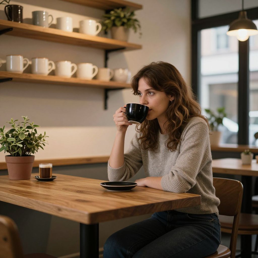 Thoughtful woman sipping from a black cup while seated at a wooden table in a cozy café, surrounded by warm lighting, shelves filled with ceramic mugs, and potted plants adding a touch of greenery near the window.
