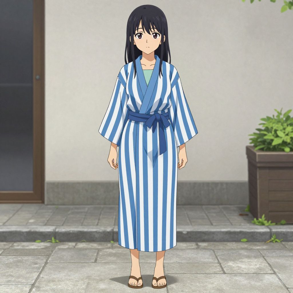 Toga Anime Costume, woman in a striped robe standing on a sidewalk