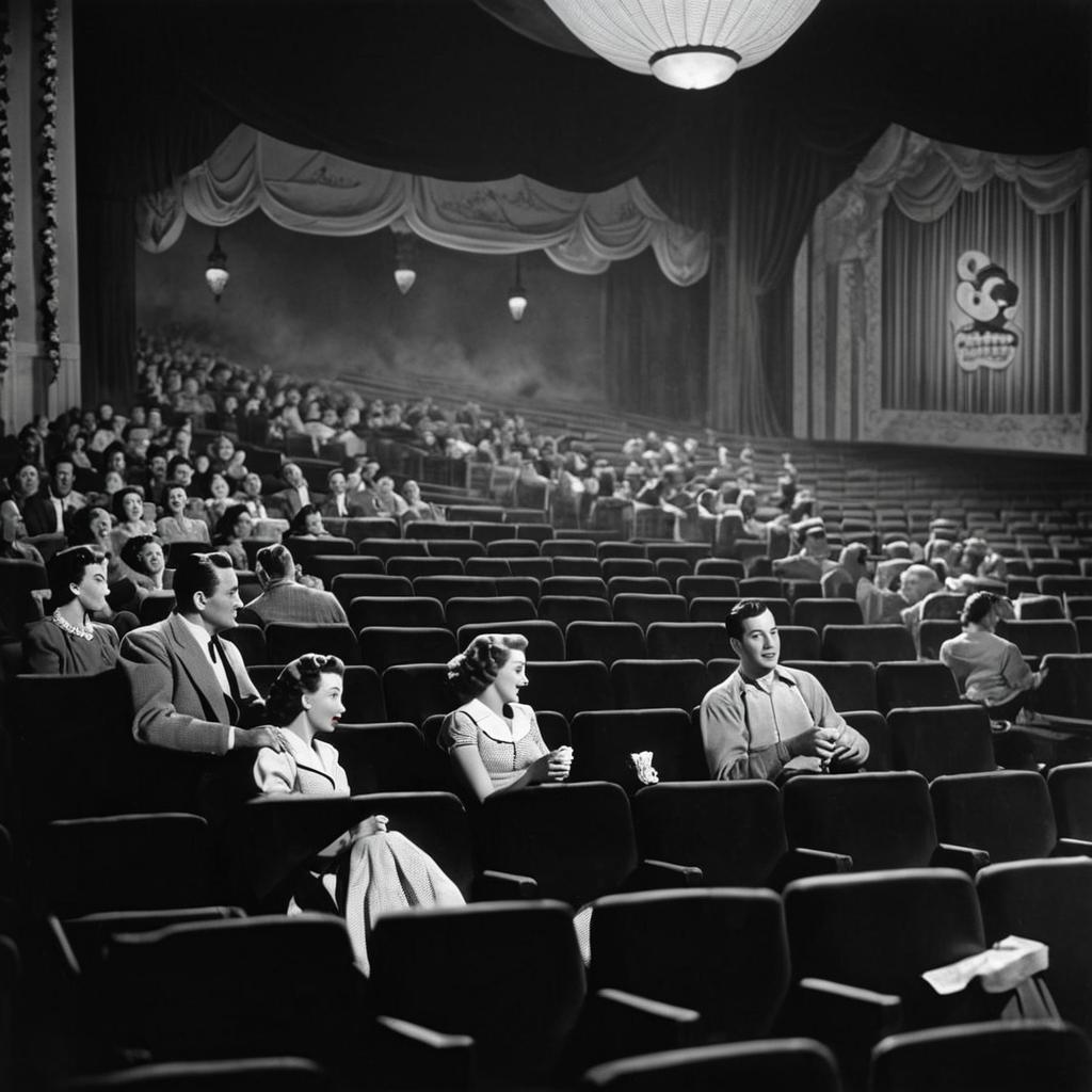 The darkened theater filled with the sounds of whispers and rustling popcorn bags, during the golden age of cinema in the 1950s, couples watching a romantic film.
