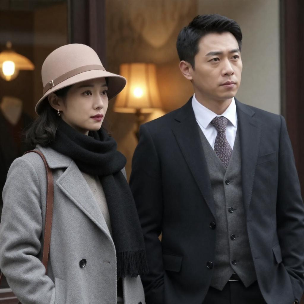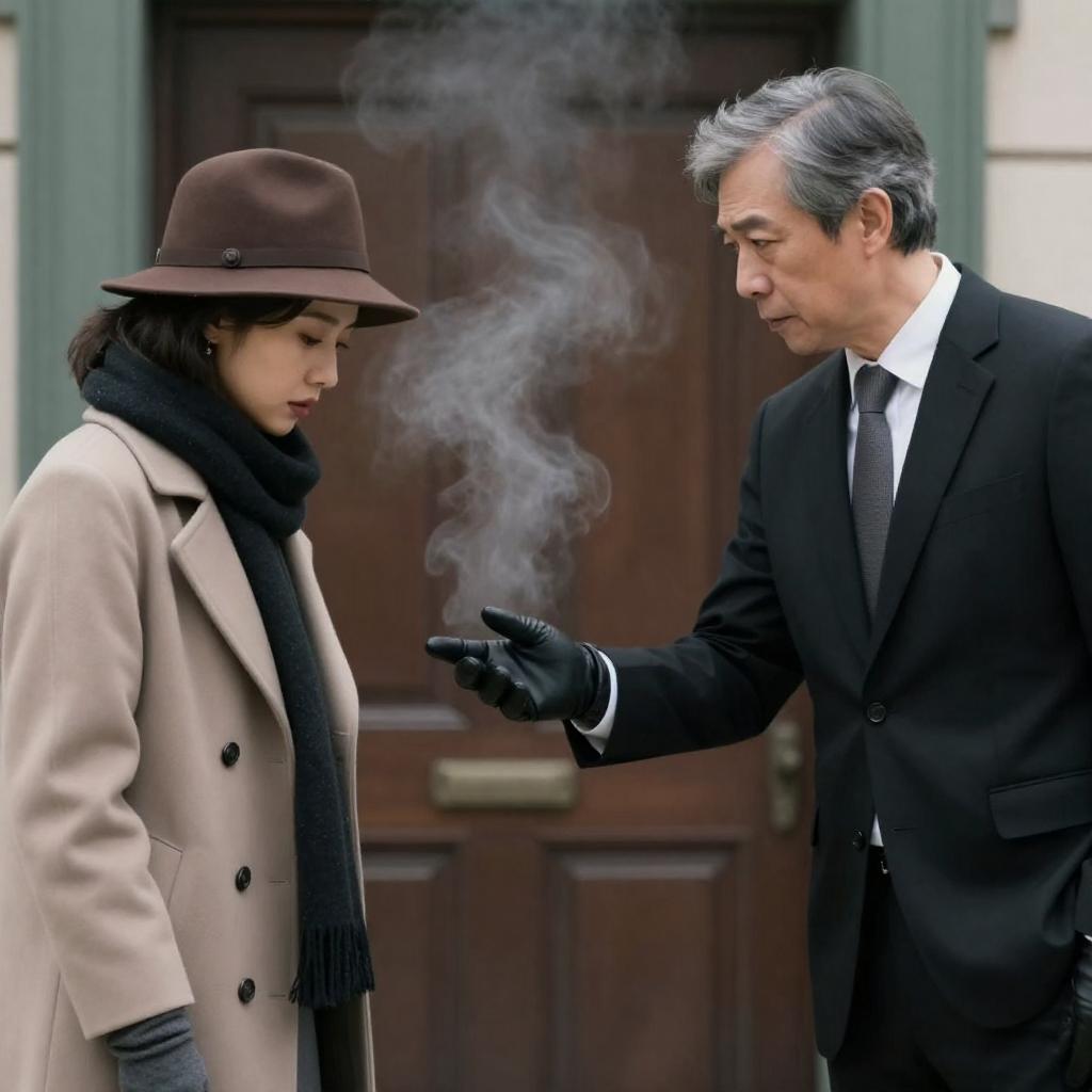 Photograph of two people. Man in black suit, white shirt, grey tie, black gloves, gray hair, reaching out to woman. Woman in beige coat, brown hat, black scarf, gray gloves, looking down. Steamy background, wooden door, green frame, intense expressions.