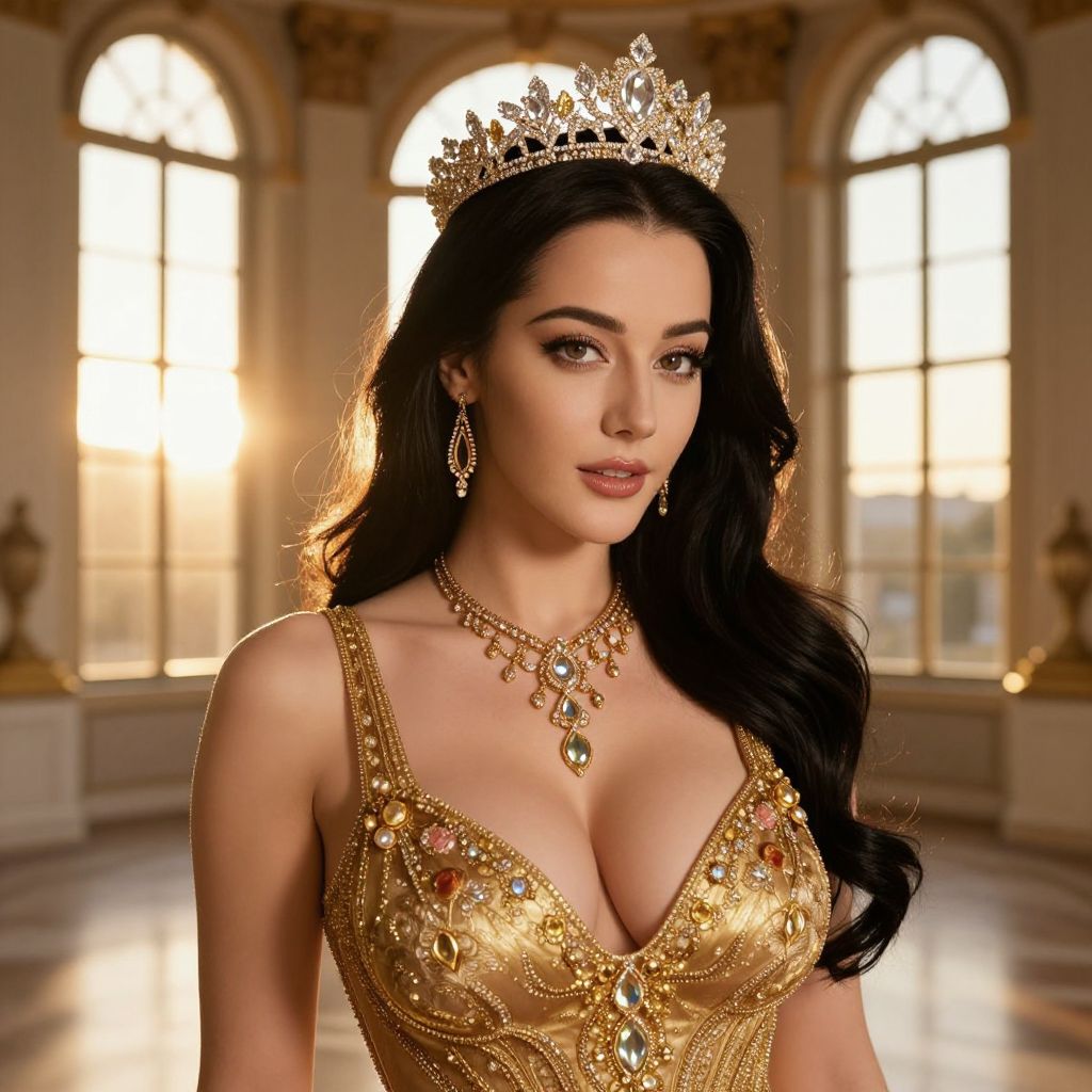 A beautiful woman with long dark hair, big tits and a sexy, alluring presence, is wearing a luxurious gold dress with intricate floral and gemstone designs, paired with a dazzling gold necklace that glimmers under the light. She wears a majestic crown on her head, adorned with sparkling diamonds and tiny golden leaves, and elegant gold earrings that drape gracefully over her ears. The setting is a grand, opulent palace at sunset, with golden rays filtering through tall windows, enhancing her radiant and regal aura. Her eyes are deep and expressive, catching the light with confidence and grace.