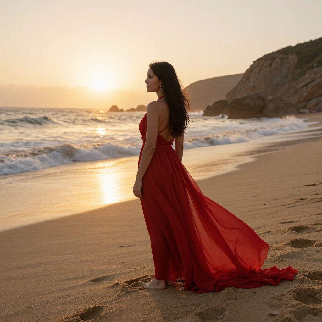 Woman in flowing red gown stands barefoot on a sandy beach, her back turned to the camera as she gazes toward the setting sun, its golden rays illuminating the ocean waves and rocky cliffs in the background.