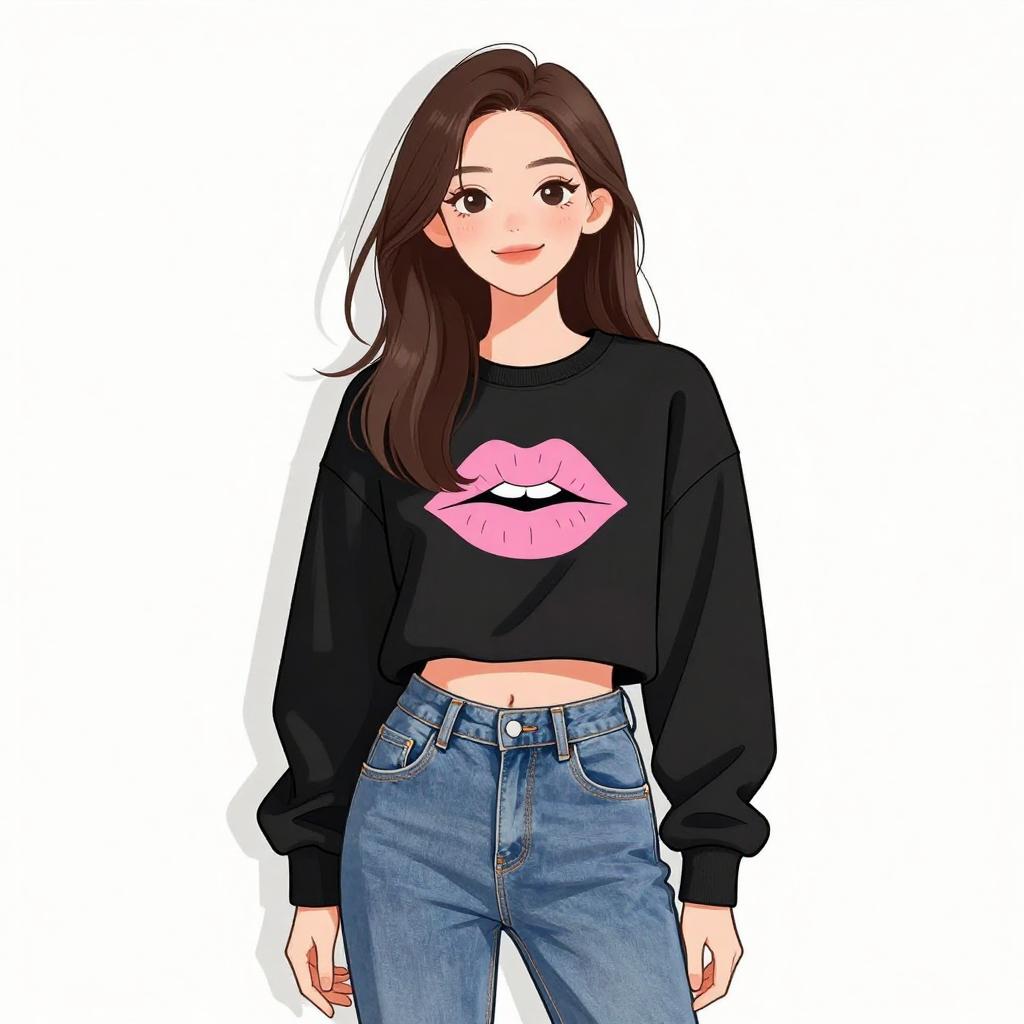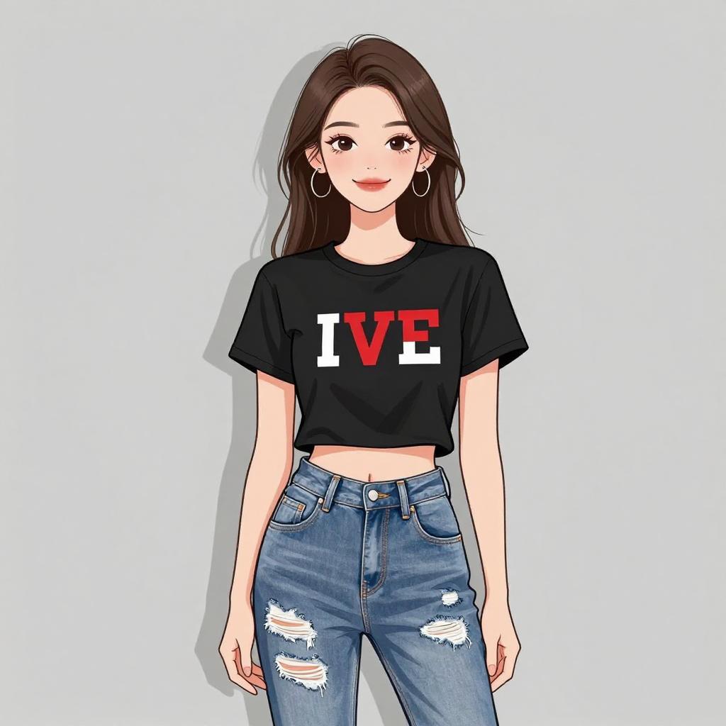 Digital anime-style drawing of a young woman with long, dark brown hair and fair skin. She wears a black, short-sleeved crop top with the word "LOVE" in white and red letters, and high-waisted, blue, ripped jeans. She has large, silver hoop earrings and a slight smile. The background is plain white, highlighting the subject. The art style is clean with bold outlines and flat colors, typical of modern anime illustrations. The woman stands confidently, with her arms relaxed by her sides.