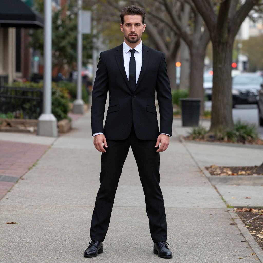 Thriller Dance Costume, man in a black suit and tie standing on a sidewalk