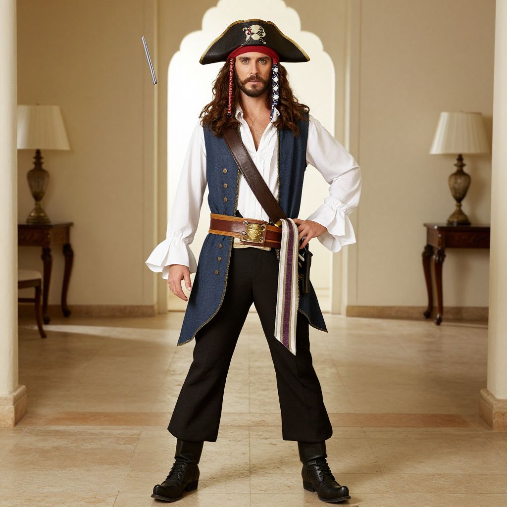 Photograph of a man standing confidently in a brightly lit, elegant hallway. He is dressed as a pirate, wearing a black tricorn hat with a white skull and crossbones, a white shirt with billowy sleeves, a navy blue vest with gold buttons, and black pants. He has long brown hair, a beard, and is holding a sword with a white hilt in his right hand. He wears a brown leather belt with a gold buckle. The background features cream-colored walls, two dark wooden tables with white lamps, and a tiled floor. The man's stance is wide and assertive.