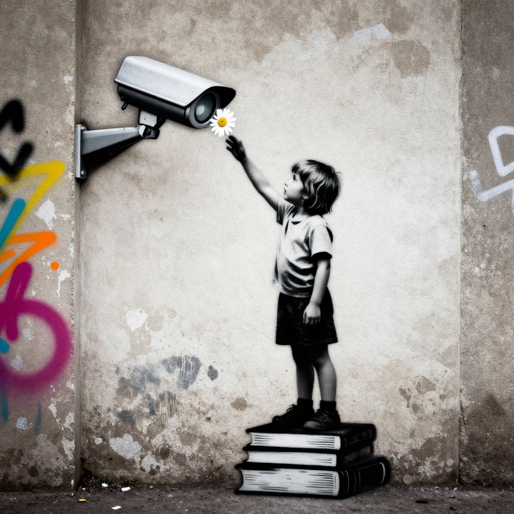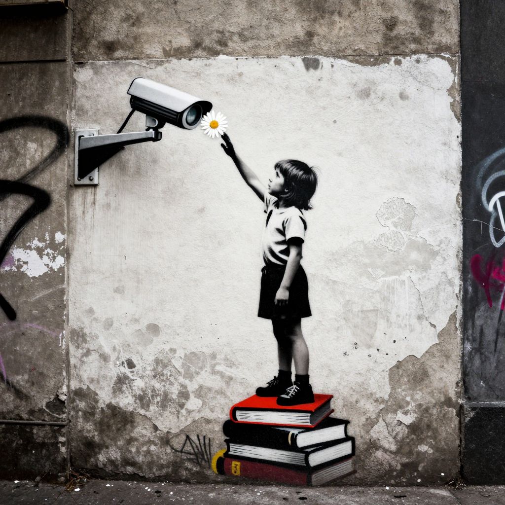 A provocative and layered composition that exudes the raw, urban aesthetic of street art, infused with political undertones and social commentary, The scene is built on a stark interplay of contrasting colors, punctuated by sharp, stenciled edges and expressive spray paint textures, A sense of gritty realism merges with bold symbolism, creating a visual narrative that challenges norms and evokes critical thought, The muted yet impactful palette emphasizes black, white, and grayscale tones, accented by bursts of vibrant, rebellious color, The central subject –[a piece of wall with a graffiti of a child standing on a stack of books to reach a surveillance camera, sticking a daisy into its lens, ]– is rendered with striking simplicity and sharp precision, juxtaposed against a textured backdrop of weathered walls or concrete surfaces, Subtle details like drips, splatters, and uneven stenciling give the image an authentic, hand-crafted feel, while the careful use of negative space amplifies the power of the subject's presence, The mood is one of defiant melancholia, where subversive humor and poignant irony coexist, leaving the viewer with an enduring sense of both unease and wonder, Banksy-inspired stencil art style