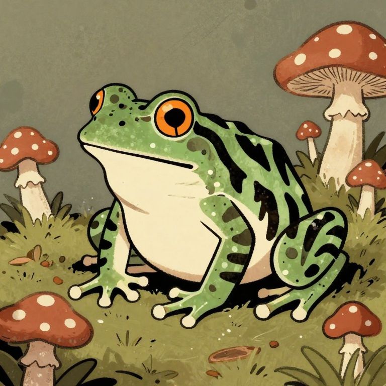 Chiffon a 1970s hand drawn style of a frog with zebra print on its skin on a bed of mushrooms in muted colors,