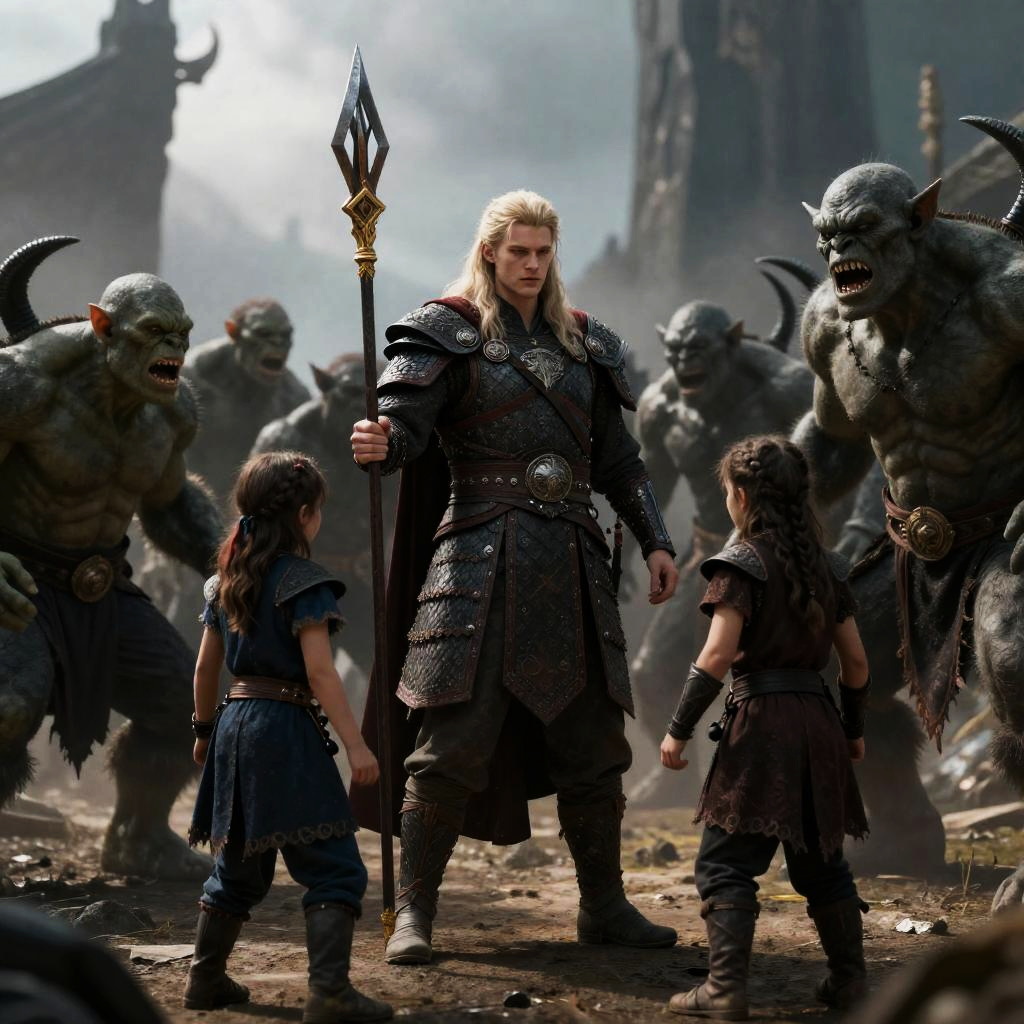 Realistic photo.warrior prince Thalion defending his children from a pack of angry orc demon imps, wide shot, intricate, hyper detailed, realistic, cinematic lighting, octane render, 8k realistic photo