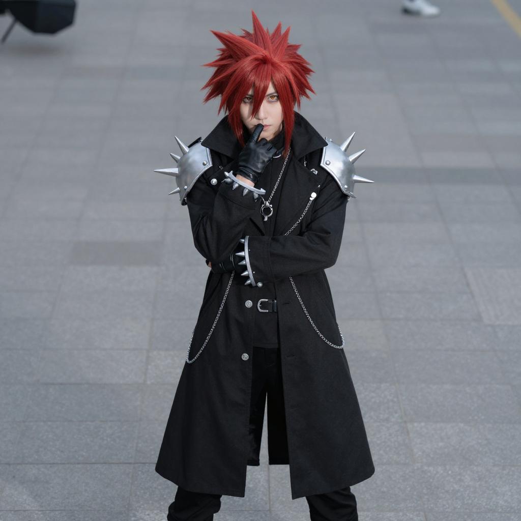 Portrait of a person in an Axel cosplay from Kingdom Hearts, featuring intense red spiked hair, a long black coat with silver chain accents, black gloves with spikes, black pants, and silver spiked shoulder details. The setting is an outdoor urban pavement background.
