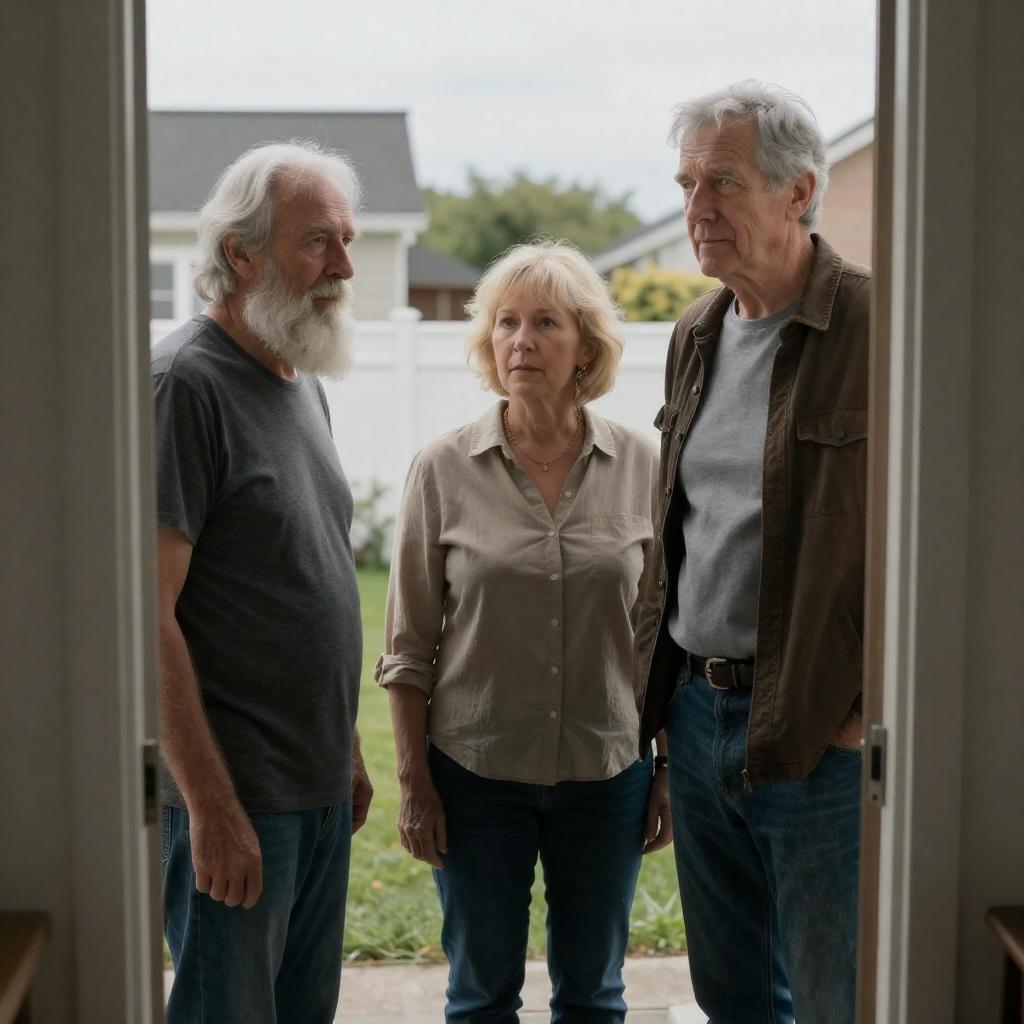 Two middle-aged men standing outside a brick house. Foreground man with grey hair, blue patterned jacket, black pants, holding fishing rod. Background man with bald head, yellow jacket, black pants, holding clothes. Fishing rod tip with orange flag. Brown door, greenery around. Foreground man's serious expression, background man's neutral.