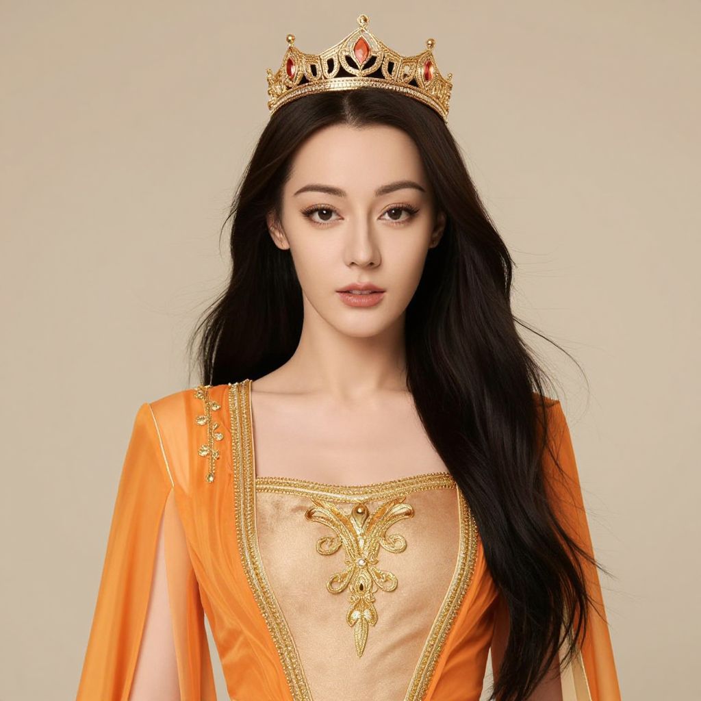 Woman with long black hair and a crown on her head. She is wearing an orange and gold outfit with a golden embroidery on the front.