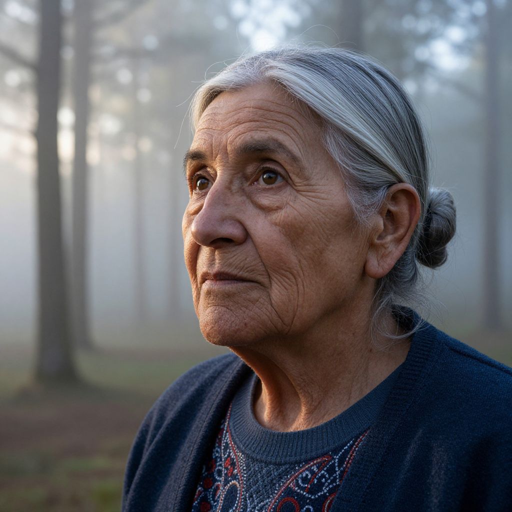 Photograph of an elderly woman with deeply wrinkled skin and silver-gray hair tied in a low bun, wearing a dark blue sweater with intricate red and white patterns. Her expressive brown eyes gaze thoughtfully into the distance. The background is a foggy forest with tall, blurred trees, creating a soft, ethereal atmosphere. The natural light highlights her weathered features and serene expression, adding a sense of calm and wisdom to the image. The focus is sharp on her face, while the background remains softly blurred.