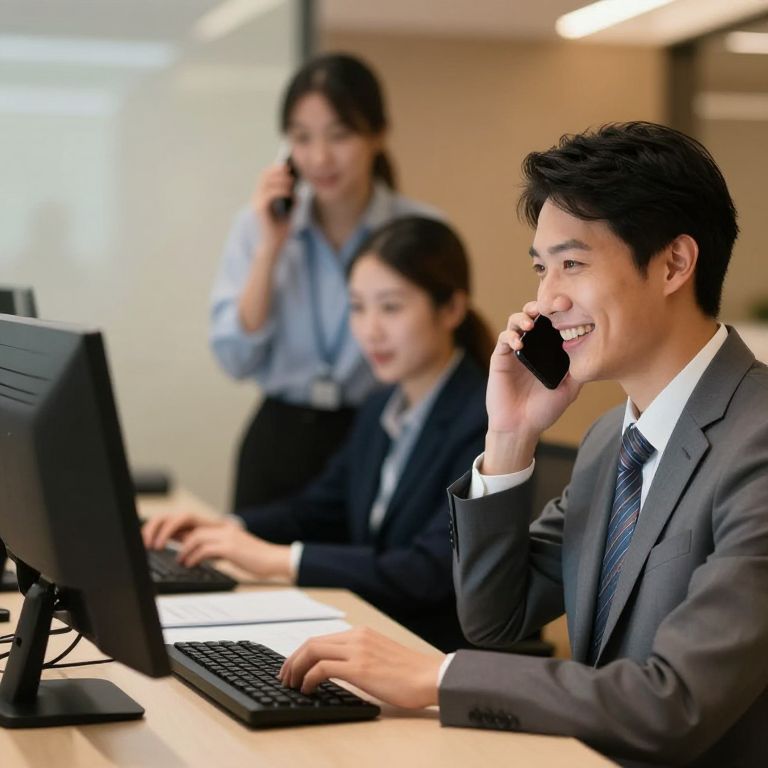 Special Effects photo of asian admins working for hotel and travel industry chat on phone smileing talk to customer, look at computer sceen,