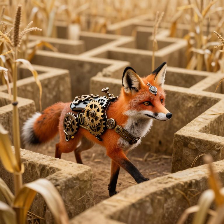 A steampunk-inspired digital illustration depicts a vibrant clockwork fox adorned with intricate brass gears and mechanical components, gracefully running through a mystical forest at golden hour, embodying the fusion of nature and industrial artistry.