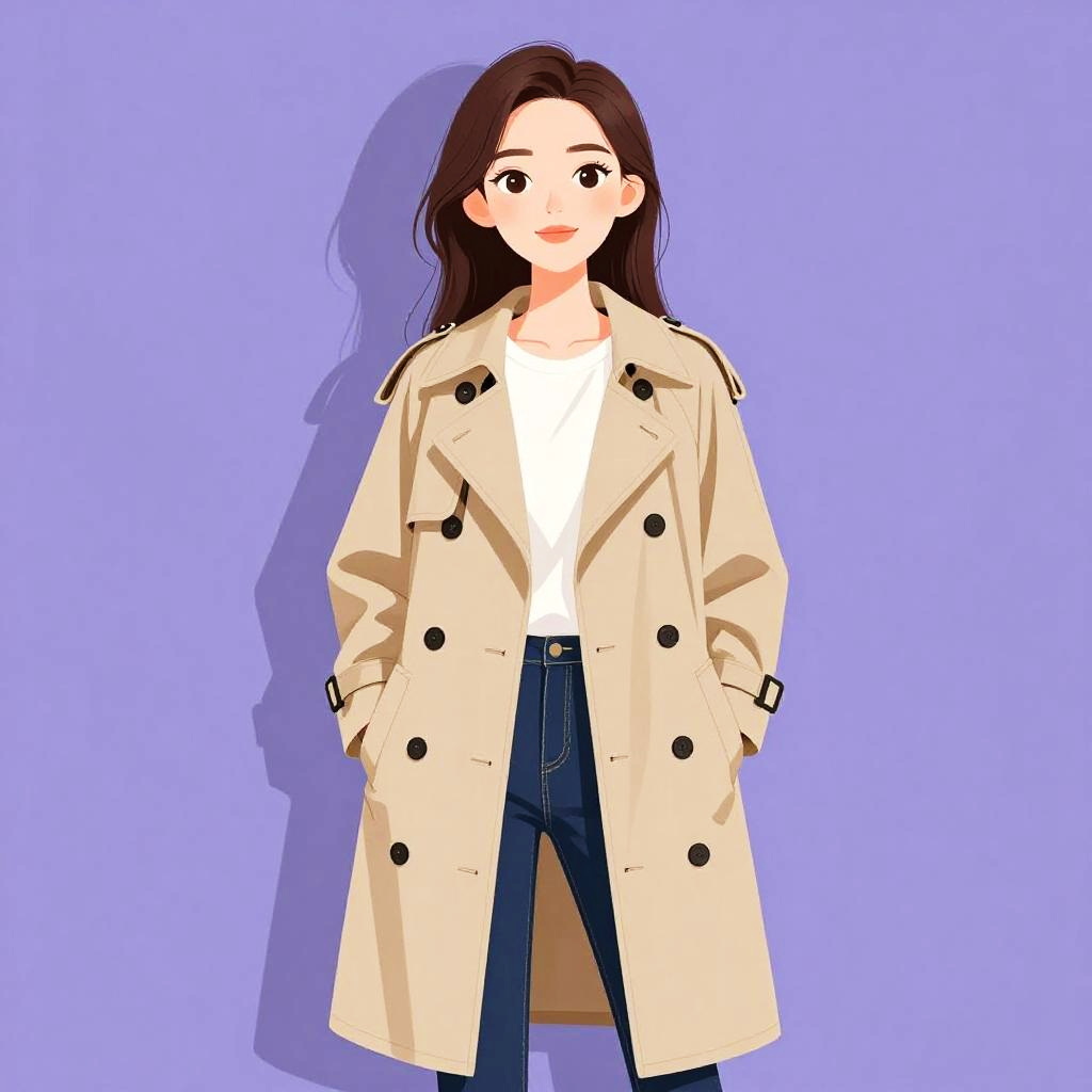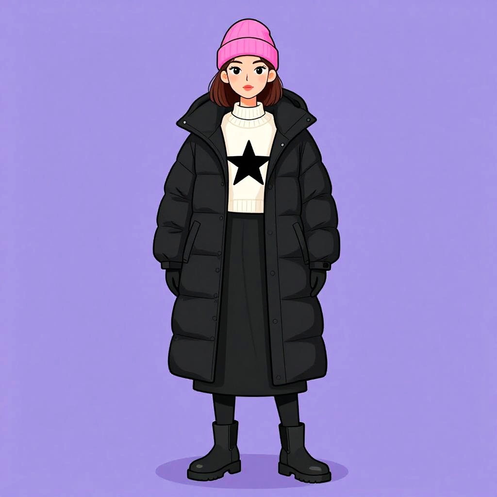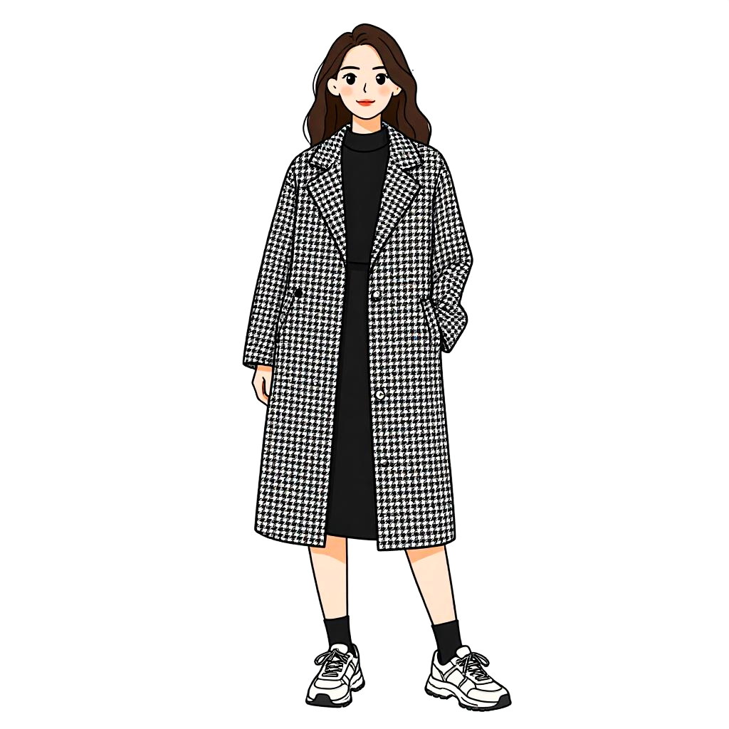 Woman with pretty face and pretty hair. Woman, contemporary casual, houndstooth patterned coat in black and white, knee-length, notched lapels, open front, paired with a simple black knee-length dress, high neckline, long sleeves, white sneakers with chunky design and gray accents, black ankle socks, natural wavy hair, minimal makeup, plain white background. --sref 1467