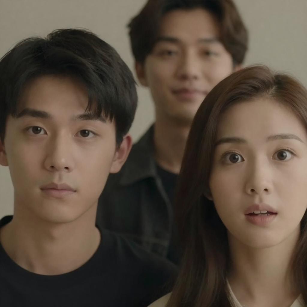 Three Asian teenagers sitting on a bench at night, wearing white school uniforms with backpacks. Left boy with short black hair, slightly smiling, hands clasped. Center girl with black hair in a ponytail, surprised expression, gray pants. Right boy with short black hair, looking sideways, hands resting on knee. Background with blurry street lights and trees.