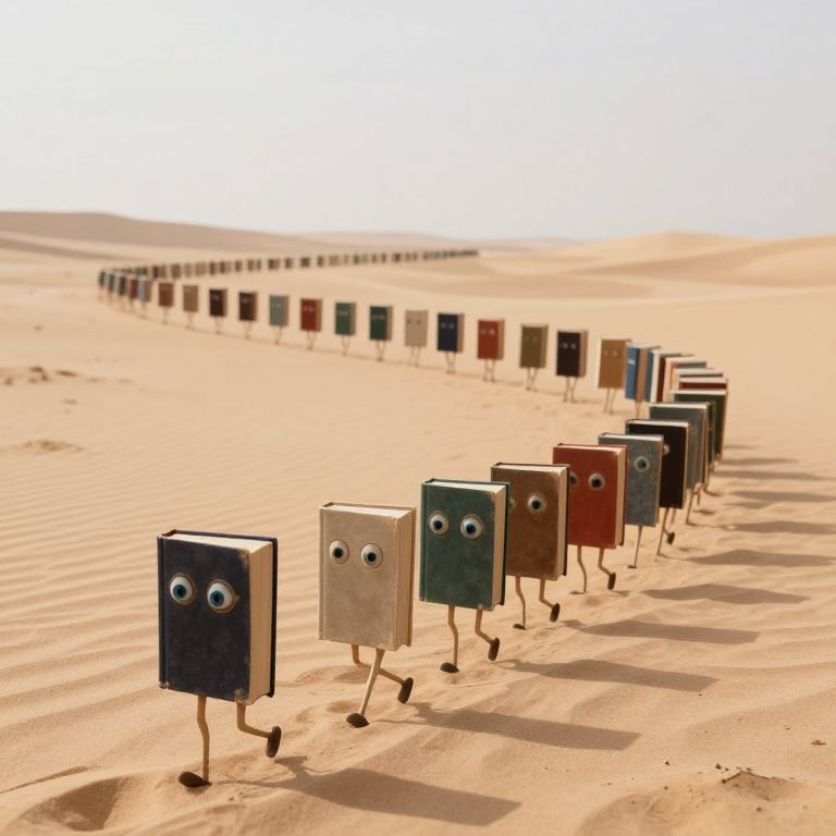 In a surreal procession across the barren desert, an endless line of books with sentient eyes marches forward, their tiny legs carrying the weight of knowledge and curiosity, evoking a poignant blend of wonder and existential solitude.