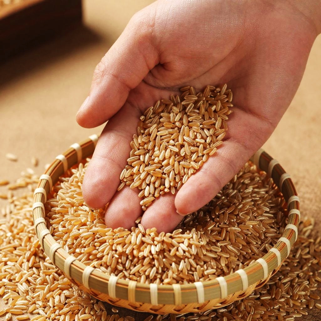 A close-up photograph of a hand pouring small, orange-brown rice grains into a woven, round basket. The hand, with light skin and slightly rough texture, is positioned centrally, gently tilting the basket. The basket is filled with more rice grains, and some spill onto a textured, brown surface in the background. The image has a warm, natural light, highlighting the grain's texture.