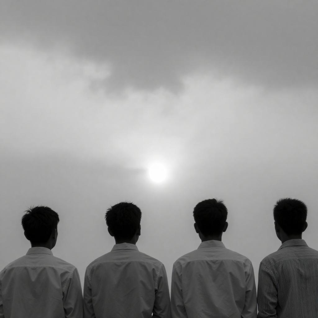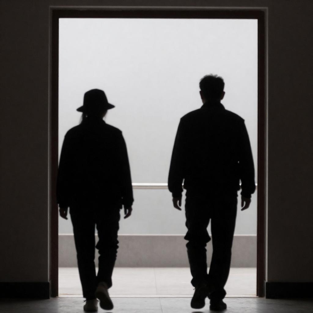 Photograph of two silhouetted figures in a doorway. One figure on the left wears a hat and stands still, while the right figure, in a jacket, walks forward. Bright light and fog fill the background. Dark, rectangular door frame surrounds them.