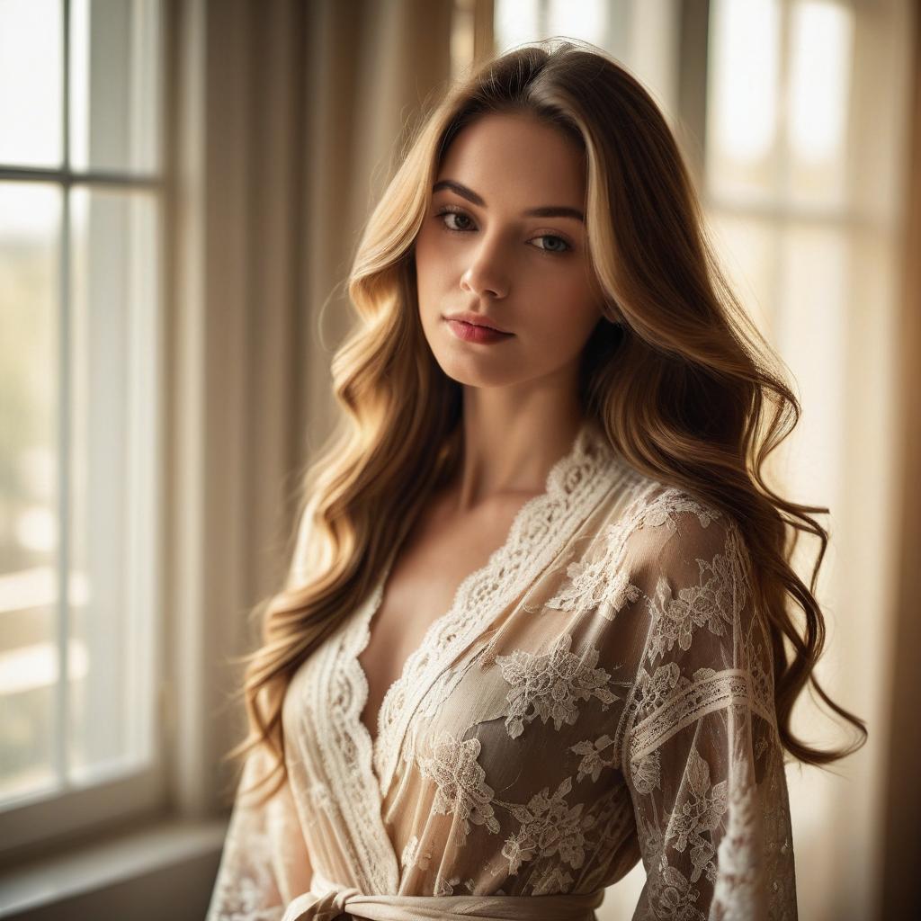 A glamorous portrait of a young woman with long golden brown hair and smooth skin, wearing a sheer creamy beige lace robe, illuminated by soft warm natural light from a window, indoor setting with blurred background, cinematic style with photorealistic details and smooth shading